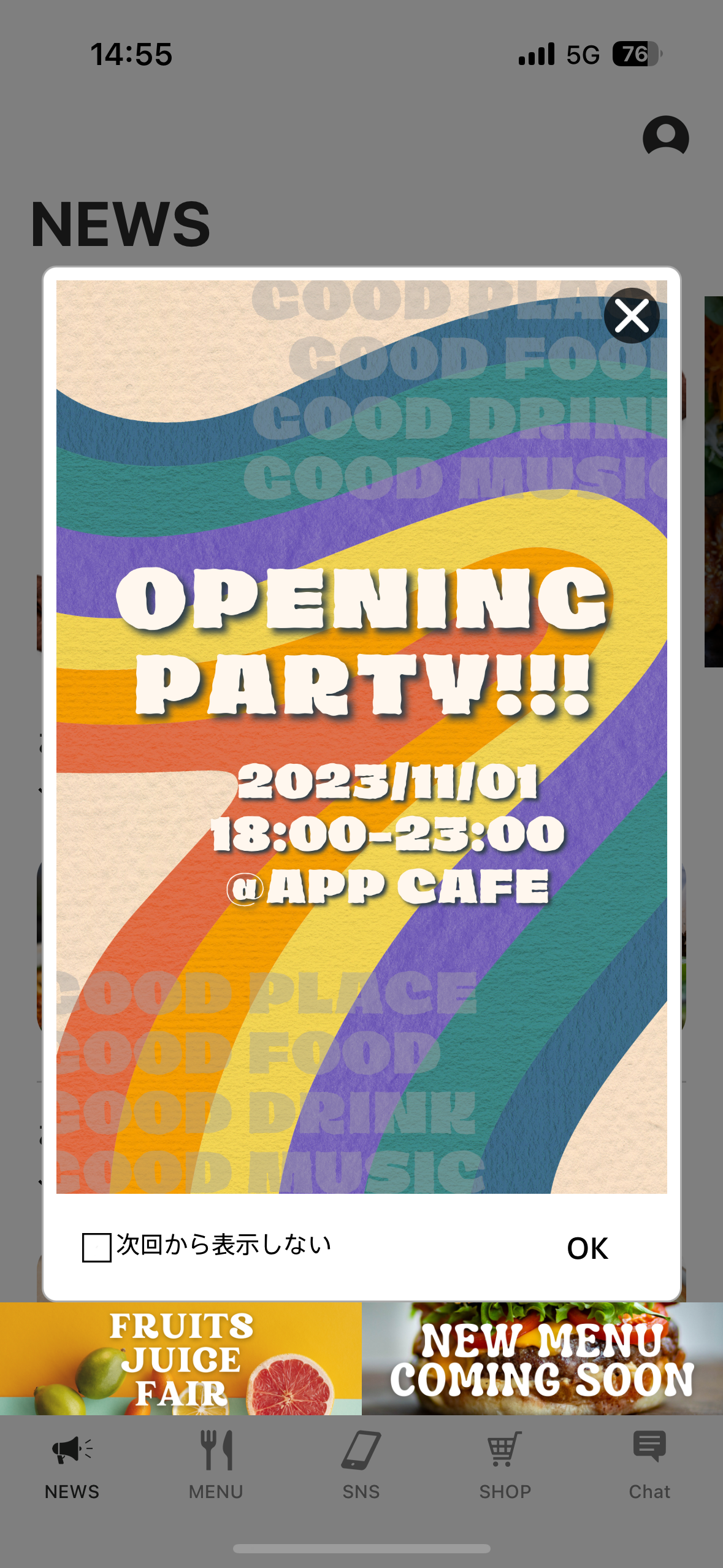 お知らせ機能を使用するとアプリのTOP画面にポップアップで画像を表示することができます。