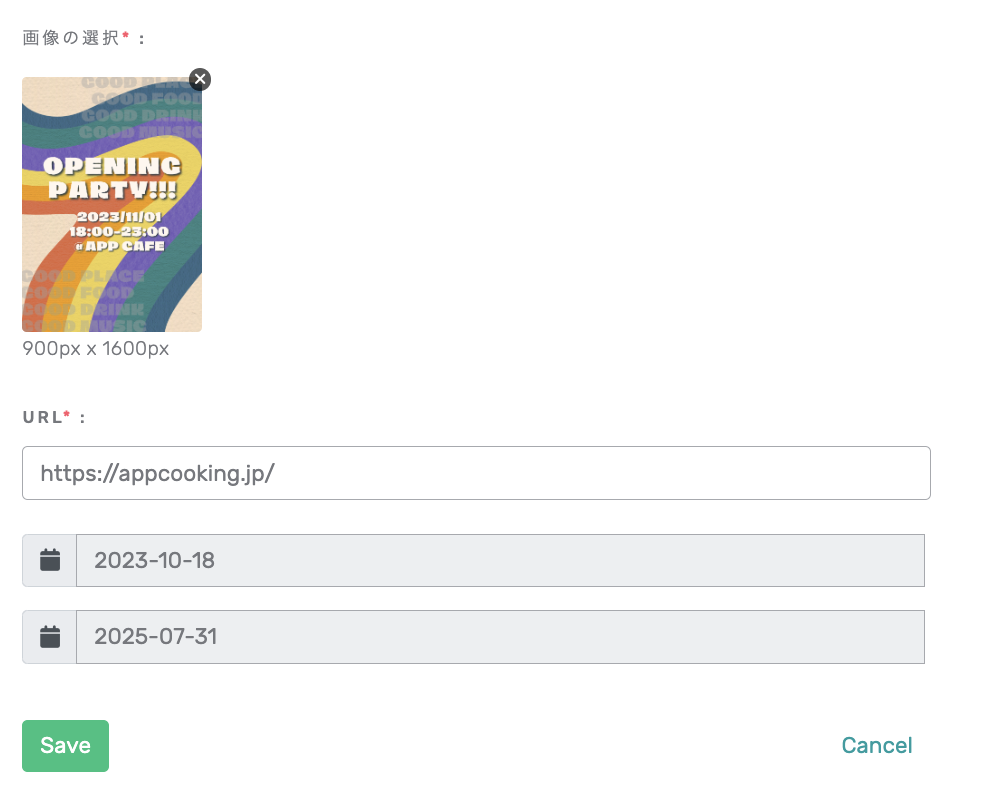 ポップアップが表示され画像登録とURL、公開期日を設定します。